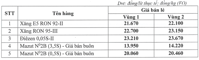 Mức giá trên có hiệu lực từ thời điểm 15 giờ 00 ngày 1 tháng 12 năm 2022 cho đến khi có thông cáo báo chí (TCBC) mới.